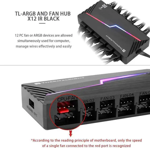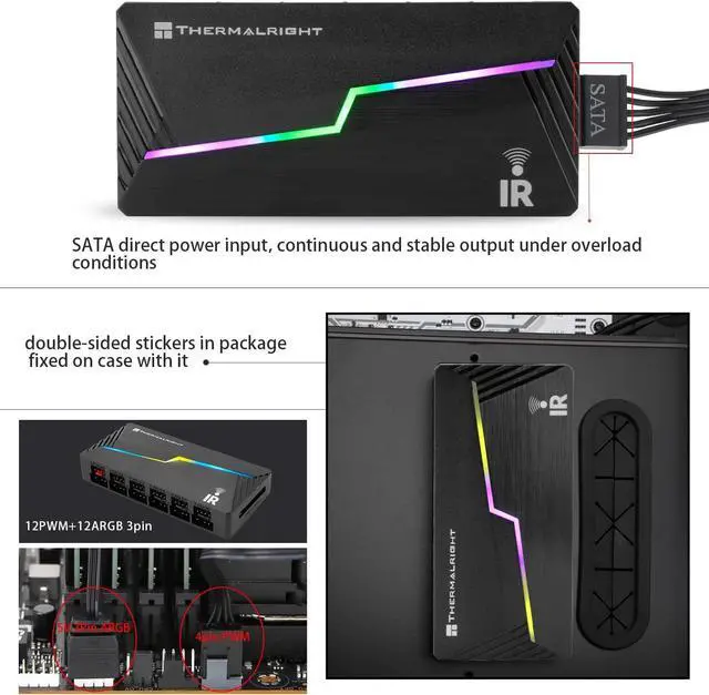 ARGB and Fan HUB X12 IR Black Hub Controller Support 12 Groups of CPU Fans,3Pin PC ARGB Controller and 4Pin PWM Fan,SATA Power Cord Direct Input(12V 4pin RGB is Not Supported)