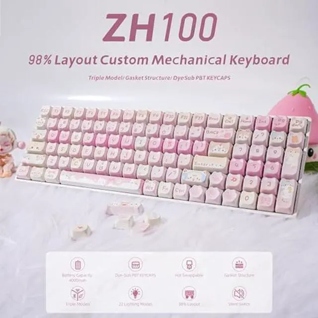 ZORNHER ZH100 Wireless Cat Mechanical Keyboard, 98% Pink Cute Creamy Keyboard with Number Pad, Full Size Hot-swappable Kitty Gaming Keyboard, Meow Meow Squad Keycaps, Silent Quiet Switches, Hot-Swappable