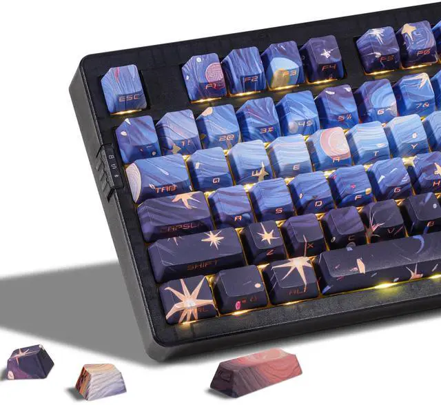 5 Side Dye Sublimation Keycaps with Clear LegendsCrafted from high-purity PBT with Dye Sublimation technology, the keycaps resist shine and wear while featuring a Starry Night theme that glows with RGB. Side-printed, molded legends ensure long-term clarity and smooth light diffusion