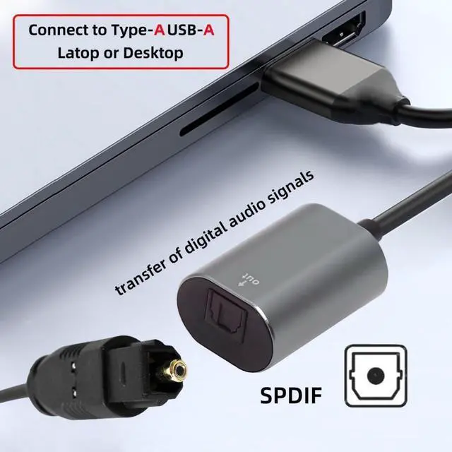 Note: Only supports one-way transmission from USB-A to SPDIF, does not support reverse (SPDIF USB-A), Some devices may require confirmation whether the USB port supports audio output. Volume control via computer is ineffective; please adjust volume through the optical receiver (e. g., amplifier or speaker)2) Converts digital audio signals from a USB Type-A port into optical signals for lossless high-speed transmission. Compatible with most USB Type-A devices, including but not limited to USB Type-A smartphones, tablets, laptops, and game consoles. 3) Can be connected to speakers, amplifiers, soundbars, or headphone amps with optical input to expand the usage scenarios of digital audio devices. 4) Supports 32KHz/ 44.1KH z/48KHz sampling rates, restoring clear and delicate sound quality with precise and pure audio detail. ensuring stable transmission and eliminating electrical noise, delivering an immersive, lossless surround sound experience. 5) Equipped with a high-performance chip that supports up to 5.1 channel surround sound, delivering an immersive audio experience Low-latency synchronized transmission, suitable for music, gaming, film, and TV scenarios.