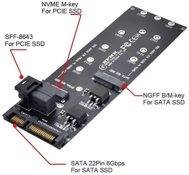 SFF-8643 to U2 Kit NGFF M-Key to HD Mini SAS NVME PCIe SSD SATA Adapter for Mainboard. Supports M. 2 modules in format 22110 2280, 2260, 2242 and 2230 with key B or key B+M based on SATA or PCIe. Hyper Kit Storage controller, Ultra PCI-E Card (PCIe 3.0 x4), The card only work for PCI-E SSD. (Not work for SAS or HD Mini SAS HD). This U. 2 M. 2 converter enables two different usage applications. 1. One M. 2 PCIe SSD in 22110, 2280, 2260, 2242 and 2230 format can be connected and used as a replacement for a 2.5 HDD.