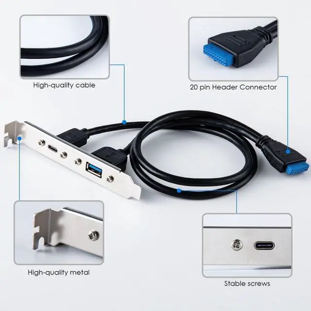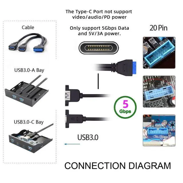 The type-C doesn't support any audio, video and docking output, Not work for any PD power, DP alt mode. ^^ Compliant with USB Base Specification 3.0, Output USB 3.0 interface and Type-C interface of PC back panel. ^^ Compliant with USB 3.0 Super-Speed (5Gbps), USB 2.0 Hi-Speed (480Mbps), USB 1.1 Low-Speed ( 1.5M bps). ^^ With this cable, you can directly connector motherboard 20pin socket, converted to dual usb 3.0 & Type-C socket. ^^ The Type-C/ Type-A port supports 5Gbps USB Data from SSD/HDD.