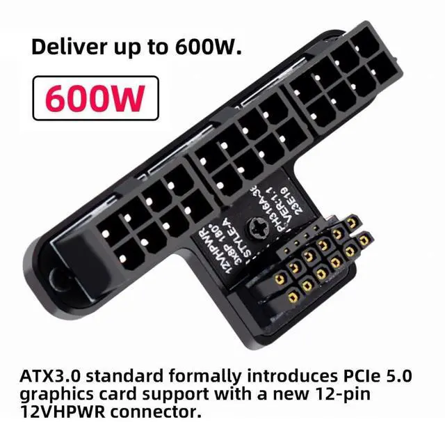 The new standard formally introduces PCIe 5.0 graphics card support with a new 12-pin 12VHPWR connector that can deliver up to 600W. The new connector is set to debut with Nvidia RTX-40 and AMD RDNA 3 cards. PCI-SIG 12VHPWR H+, including 12 pin power supply terminal, and 4 pin signal terminal on the side, Capable of delivering up to 600W of power. Our 12VHPWR to 3xATX8P 90 Degree Adapter increases more space between your GPU and your side panel. This enables installation of super wide cards in more narrow chassis. The angled type Allowing you to connect it to a female port, even if space around the port is limited.