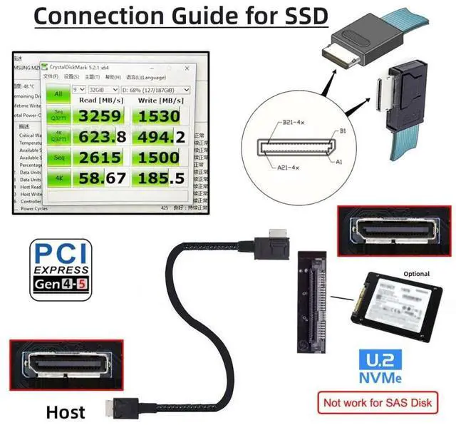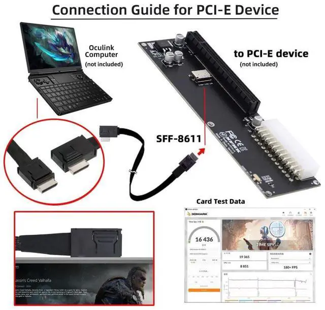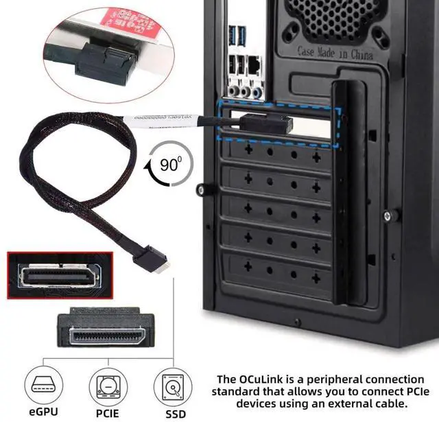 1This OCuLink cable can be used to connect internal devices, e. g. a backplane with OCuLink SFF-8611 connector to a controller with OCuLink SFF-8611 connector. ^^ 2Data transfer rate up to 64Gbps, Transmits PCI Express 4.0 signals using the oculink protocol. ^^ 3OCuLink is a peripheral connection standard that allows you to connect PCIe devices using an external cable. ^^ 4It offers higher bandwidth, lower cost, and better performance for external graphics cards & SSD. ^^ 5Angled Design, The angled type Allowing you to connect it to a female port, even if space around the port is limited.