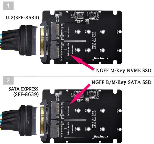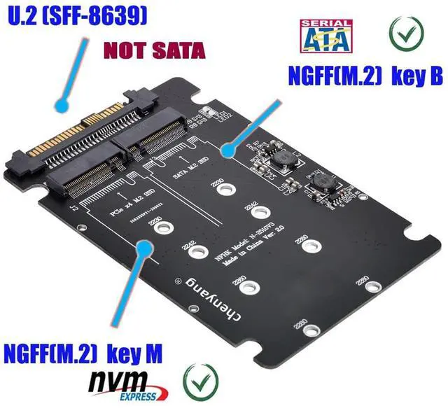 Note: This adapter card can support M. 2 NGFF SSDs of two protocols, but can only support the conversion of SATA M. 2 NGFF SSD to U. 2 SATA interface, or NVMe M. 2 NGFF SSD to SFF-8639 (that is, U. 2) interface! ^^ 2) The adapter card cannot support the conversion of SATA M. 2 NGFF SSD to SFF-8639 (that is, U. 2) interface or NVMe M. 2 NGFF SSD to 2.5 -inch SATA interface! ^^ 3) This product only supports the use of SFF-8643 to SFF-8639 data cable to connect to the SFF-8643 interface of U. 2 protocol. ^^ 4)
