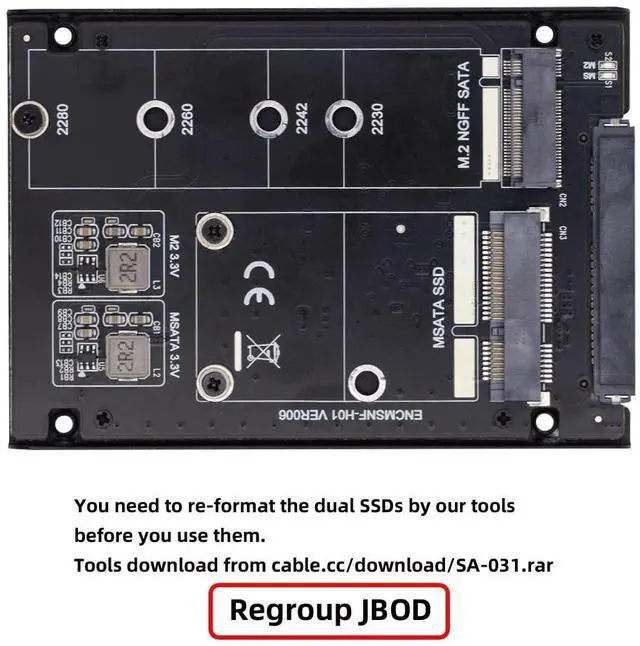 Support the MSATA and NGFF B+M (SATA mode) SSD. You can connect it to desktop or laptop. Dual MSATA NGFF B+M SSD can work at one SSD with JOBD Raid Mode. JBOD is short for Just a Bunch of Disks or Just a Bunch of Drives, which is a storage structure including multiple disk drives within one single storage enclosure. It refers to the hard disks on the computer that havent been configured in terms of RAID (Redundant Arrays of Independent Disks). JBOD drives are individual drives, which means that drives in JBOD enclosure can function individually.