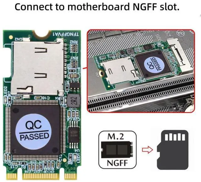This adapter card can convert TF (micro SD) card into SSD with ngff (m. 2) interface. Before using this product, please insert the TF card into the corresponding TF socket, and then insert it into the ngff (m. 2) slot in the off state. After power on, the LED flashes, indicating that the data reading of TF card is normal. After initial use or TF card configuration change, the TF card needs to be initialized and formatted. After formatting, you can perform any data operation on the TF card.