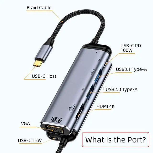 Output: 1*HDMI Female 4K. 1*VGA Female 1080p. 1*USB 2.0 Type-A Female. 1*USB 3.1 Type-A Female. 1*USB 3.1 Type-C Female.
