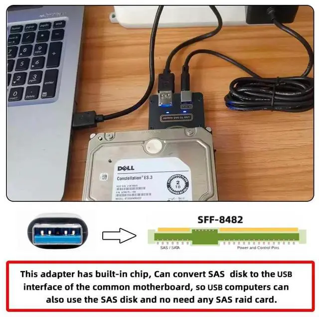 Note: This adapter needs to be paired with a 12V/3A DC 5.5 * 2.1 mm power supply to work, the power supply is not included in the package. ^^ 2) If your USB interface without SAS function, Connect our adapter, it can directly read/write SAS hard disk, support win7, win10, win11, lunix operating system. ^^ 3) This adapter has built-in chip, Can convert SAS disk to the USB interface of the common motherboard, so USB computers can also use the SAS disk and no need any SAS raid card. ^^ 4) After conversion, the SMART of the SAS hard disk will display incomplete or no information, but it will not affect normal reading and writing. ^^ 5) Only SFF-8482 SAS hard disks are supported, and SFF-8639 U. 2 hard disks are not supported.