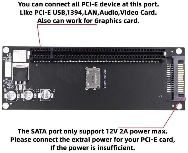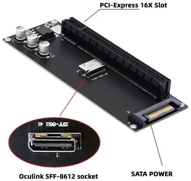 The SATA power port only support 12V 2A power max. Please connect the extral power for your PCI-E card if the power is insufficient. ^^ Oculink 4x connectors are internal and external small form factor PCI-E connectors and cables optimized for the client and market. ^^ This oculink pci-e converter enables belowing applications. ^^ One PCIE PCI-Express 16x 4x device can be connected, The converter can be installed into the system internally through the SFF-8611/8612 oculink interface. ^^ The converter support all standard PCI-E 16x 8x 4x card, like USB, LAN, 1394, Audio, Graphics Card.
