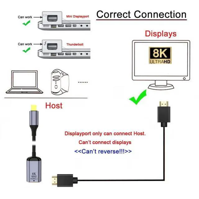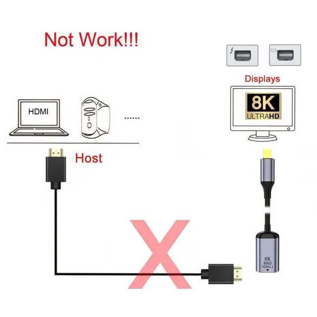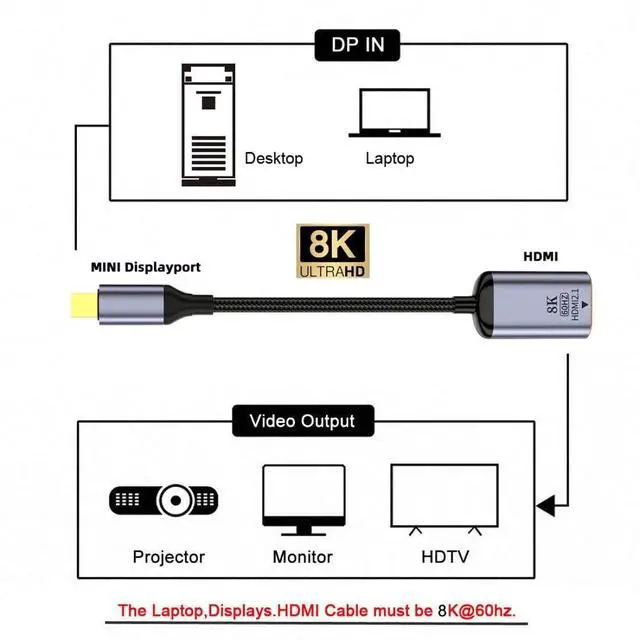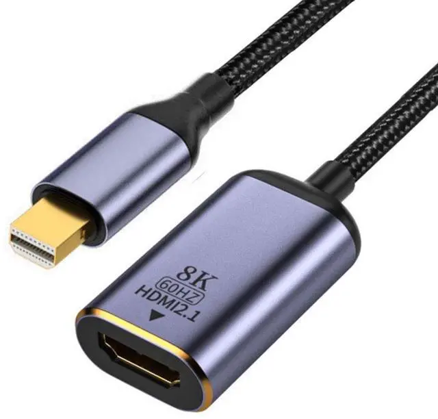 MINI DisplayPort 1.4 Source to HDMI 2.0 Display 8K UHD 4K MINIDP to HDMI Male Monitor Adapter Cable. This is a 8K MINI DisplayPort to HDMI cable, Dont support HDMI to MINI DP. It is not Bi-directional. MINI DP x HDMI cable supports 8K@60Hz, 4K@60Hz for MINI DisplayPort Enabled Desktops and Laptops to Connect to HDMI Displays, enjoy home theater with 8K/4K high resolution. MINI Displayport Male to HDMI Female cable with Slim Aluminum Shell transmits high-definition video and audio from your computer to an HDTV for video streaming or gaming. Gold-plated MINI-dp to hdmi monitor cable Video 8K, 4K UHD 2160p, HD 1080p, aluminum slim case, all of them ensure a strength connectivity between devices; With 8K/4K MINI DP to HDMI adapter under mirror mode, extend mode.