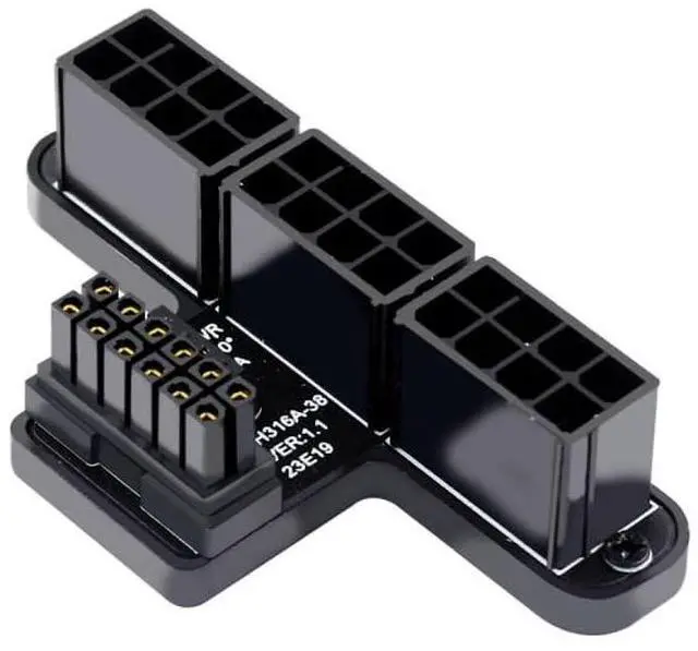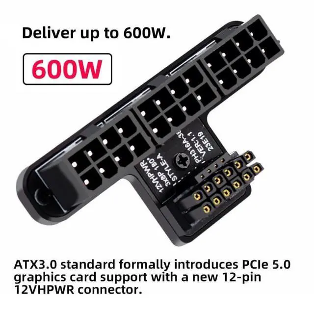 The angled type Allowing you to connect it to a female port, even if space around the port is limited. The new standard formally introduces PCIe 5.0 graphics card support with a new 12-pin 12VHPWR connector that can deliver up to 600W. PCI-SIG 12VHPWR H+, including 12 pin power supply terminal, and 4 pin signal terminal on the side, Capable of delivering up to 600W of power. ATX 3.0 PCIe 5.0 12+4pin 12VHPWR 90 Degree Angled Adapter is designed for GeForce RTX 3090Ti 4070 Ti 4080 4090 GPU. Our 12VHPWR to 3 ATX8P 90 Degree Adapter only produces 11mm from your graphics card, increases more space between your GPU and your side panel.