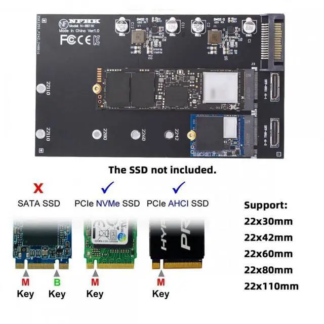 Dual Oculink SFF-8612 SFF-8611 to M. 2 NGFF M-Key NVME PCIe SSD 2280 22110mm Adapter for MainboardOculink 4x connectors are internal and external small form factor PCI-E connectors and cables optimized for the client and market. Hyper Kit Storage controller, Ultra PCI-E oculink interface (PCIe 4.0 / 5.0 x4), The card work for PCI-E NVME SSD. (Not work for SAS or Slimeline SAS HD) This M. 2 converter enables belowing applications: Dual M. 2 NVME PCIe SSD in 2280, 2260, 2242 and 2230 format can be connected, The converter can be installed into the system internally through Dual SFF-8611/8612 oculink interface. and the SATA power is required. The converter work for one oculink and one NVME, or Two oculink and two NVME. This oculink M. 2 converter can't convert NVME to SATA/SAS, also can't covert NGFF/SATA/SAS to Oculink.