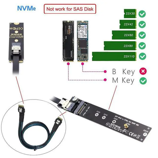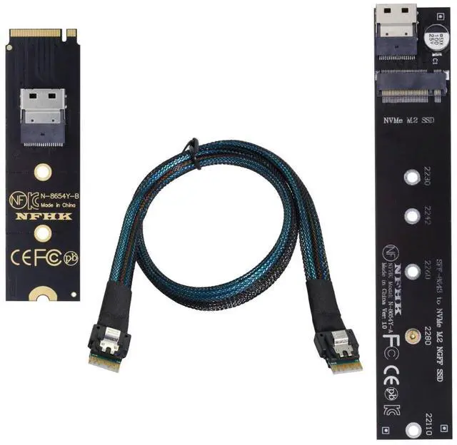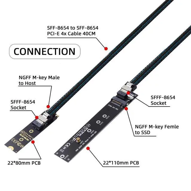 The product included two PCBA and one cable. The cable is 40cm length and included SFF-8654 Connector. ^^ The two PCBA and one cable must be connect together. ^^ Support NVME extension only, it can't convert NVME to SFF-8654, also can't convert SFF-8654 to NVME. ^^ Extend the NVME from 2242/2260/2280 socket to 2230/2240/2260/2280/22110 cable. ^^ NGFF M-Key NVME Male to Female Extension Cable 40cm with SFF-8654 Connector for Mainboard SSD.