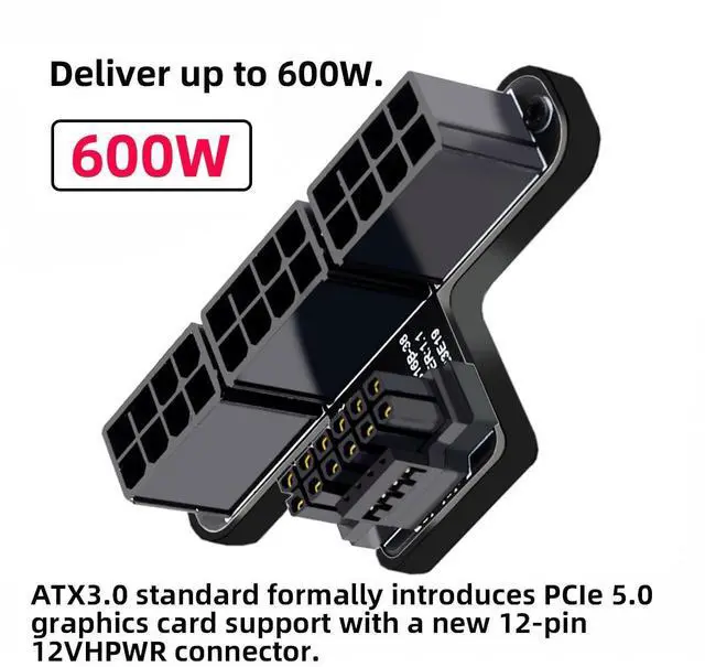 The new standard formally introduces PCIe 5.0 graphics card support with a new 12-pin 12VHPWR connector that can deliver up to 600W. The new connector is set to debut with Nvidia RTX-40 and AMD RDNA 3 cards. PCI-SIG 12VHPWR H+, including 12 pin power supply terminal, and 4 pin signal terminal on the side, Capable of delivering up to 600W of power. Our 12VHPWR to 3xATX8P 90 Degree Adapter increases more space between your GPU and your side panel. This enables installation of super wide cards in more narrow chassis. The angled type Allowing you to connect it to a female port, even if space around the port is limited.