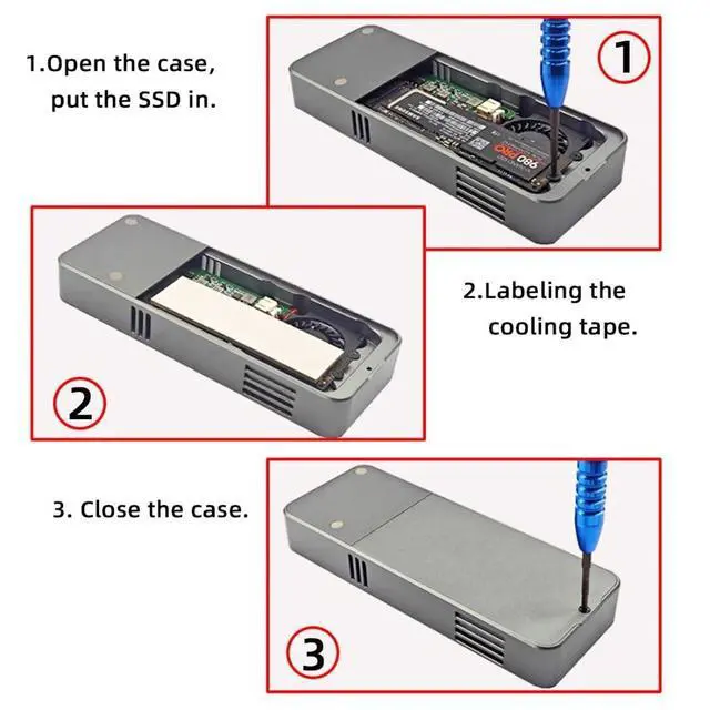 4) Sturdy and Durable: Featuring a robust aluminum alloy body and unique CNC machining technology, the product is built to be rugged and durable, capable of withstanding drops of up to 2 meters. The all-aluminum body and cooling fan provides excellent heat dissipation performance, and when paired with the included Thermal Compound Pads, it quickly dissipates heat, helping to reduce internal temperatures and maintain the SSD's optimal performance. 5) Quick Installation, Easy to