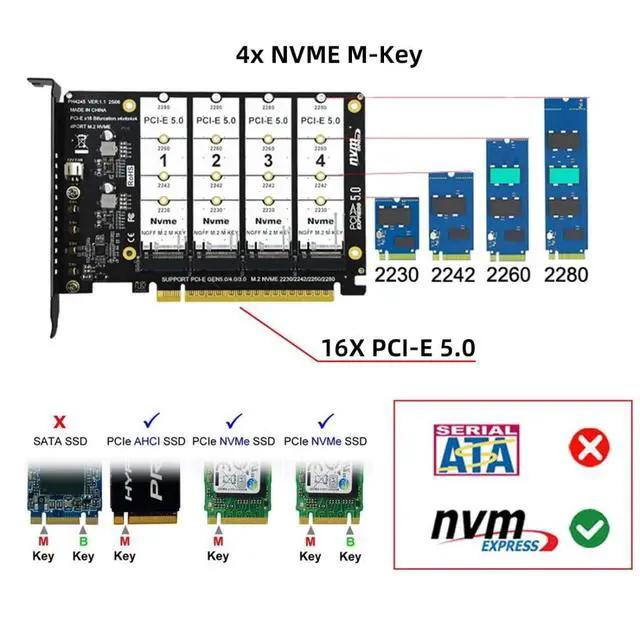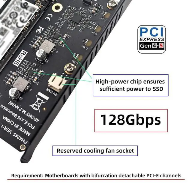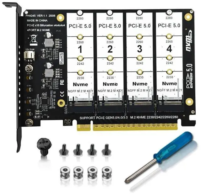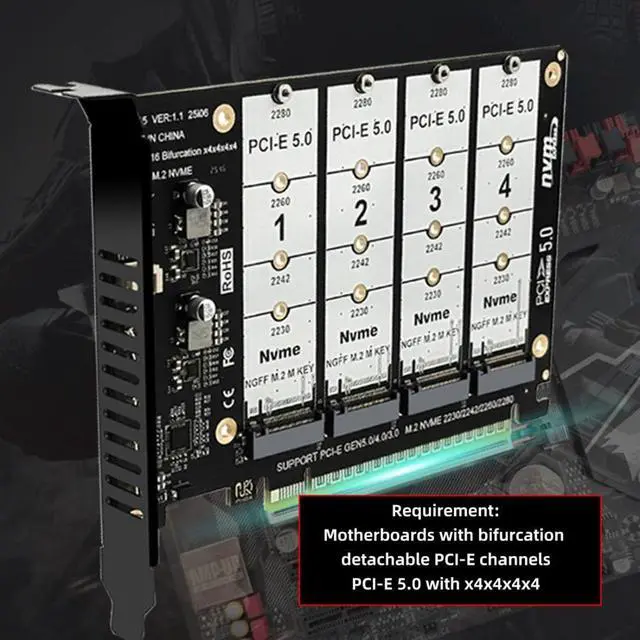 Note: Only supports motherboards with bifurcation detachable PCI-E channels; Control the operation of four disks based on the motherboard PCIE channel, The motherboard without PCIE signal split can only recognize one disk. ^^ 2) The card does not support actual hardware raid, the product only supports the formation of Virtual raid under win10/win10 system, or the use of other third-party software to build raid. ^^ 3) Built-in multiple sets of high-power DC modules for sustainable and stable work; The innovative design can accommodate four NVMEs of the chassis, and can support simultaneous operation. ^^ 4) Four status indicator LEDs correspond to four M. 2 slots. The PCB's light-transmitting design allows for a clear view from the back. The LEDs are off when no SSD is connected, lit when an SSD is connected, and flashing when data is being transferred. ^^ 5) The adapter card has a pre-installed fan connector, so you can add a fan yourself.