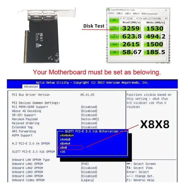 ^^ 4) Note: Only supports motherboards with detachable PCI-E channels; Control the operation of four disks based on the motherboard PCIE channel, The motherboard without PCIE signal split can only recognize one disk. ^^ 5)