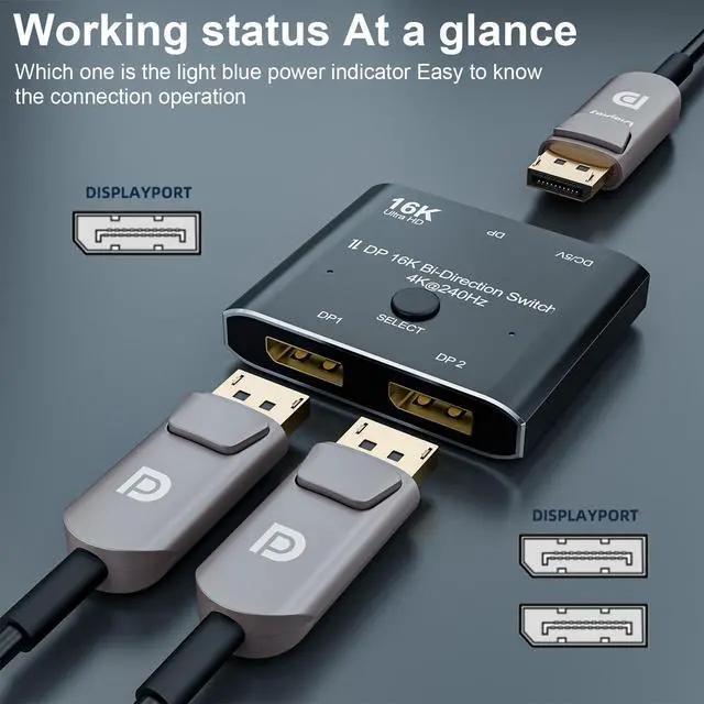 16K DisplayPort 2.0 Switch: Support 16K@60Hz, 8K@60Hz, 4K@240Hz, 4K@144Hz, 1080P@240Hz resolution, provide you with transfer rates up to 80Gbps and backward compatible with all previous DisplayPort standards.