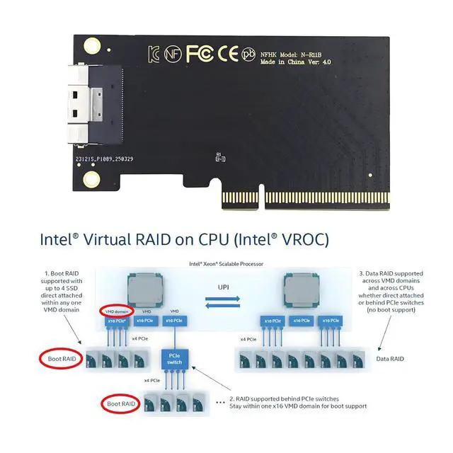 External Slimline SFF-8654 8X 74Pin to PCIE Express 3.0 PCIE 4.0 Raid Card VROC Raid0 Hyper AdapterOne detachable PCIE PCI-Express 8x motherboard can be connected, The converter can be installed into the system internally through the SFF-8654 interface. Only supports motherboards with detachable PCI-E channels; Control the operation of two disks based on the motherboard PCIE channel, The motherboard without PCIE signal split can only recognize one disk.