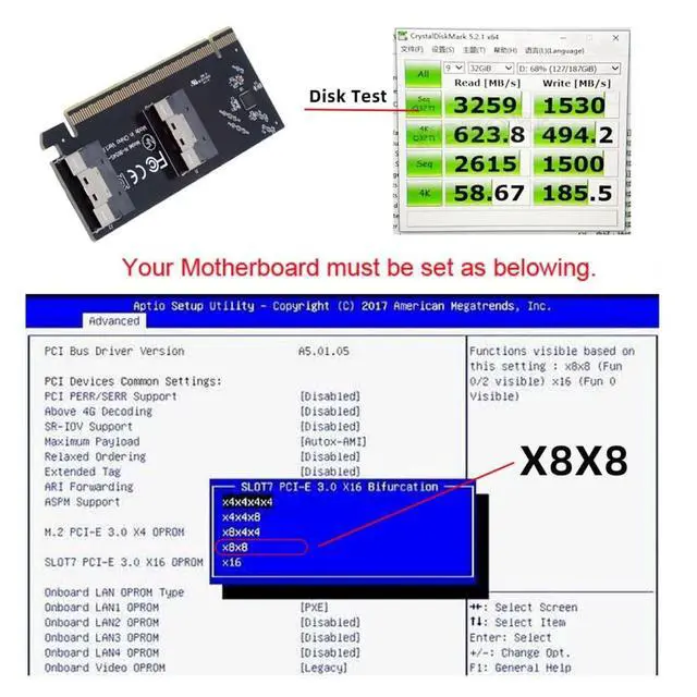 ^^ 4) Note: Only supports motherboards with detachable PCI-E channels; Control the operation of four disks based on the motherboard PCIE channel, The motherboard without PCIE signal split can only recognize one disk. ^^ 5)