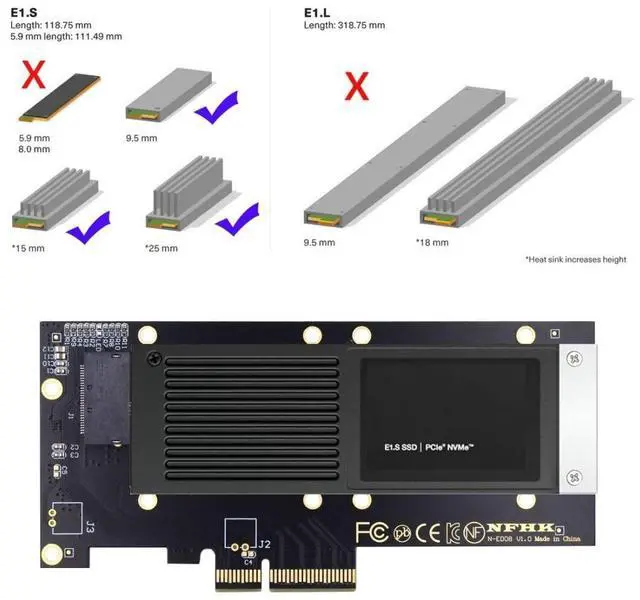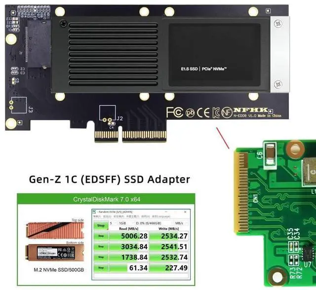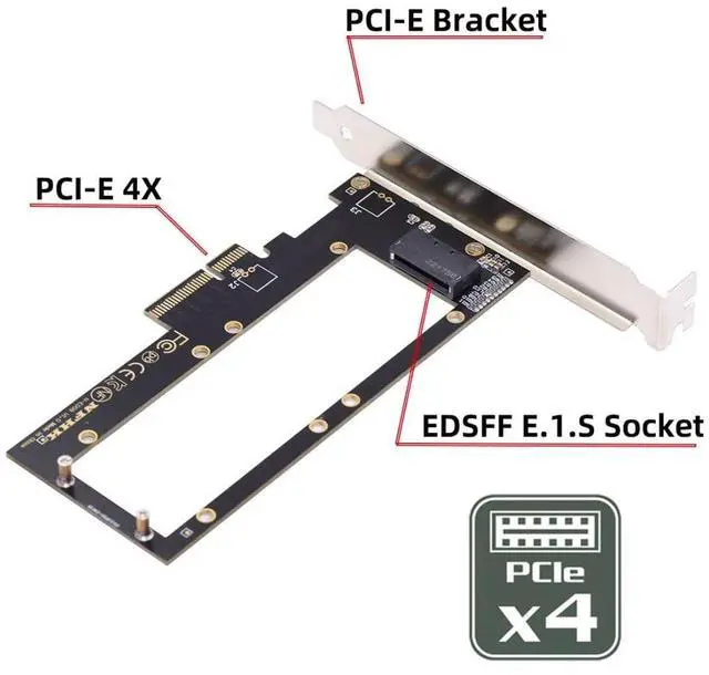This converter enables the connection of a GEN-Z SSD in E1. S. Fit for 9.5 mm & 15mm & 25mm thickness SSD with heat sink. like PM9A3 PM9D3 P5801X) Low profile and Regular size PCIe bracket on board. The converter can be installed into your system internally through the PCI-E 4X interface. Thus an EDSFF E1. S SSD becomes an PCI-E SSD, which can be used in IoT, data center and server area. Compliant with PCI Express 4.0. No driver installation is required. Most of the latest operating systems support PCIe-NVMe SSDs.