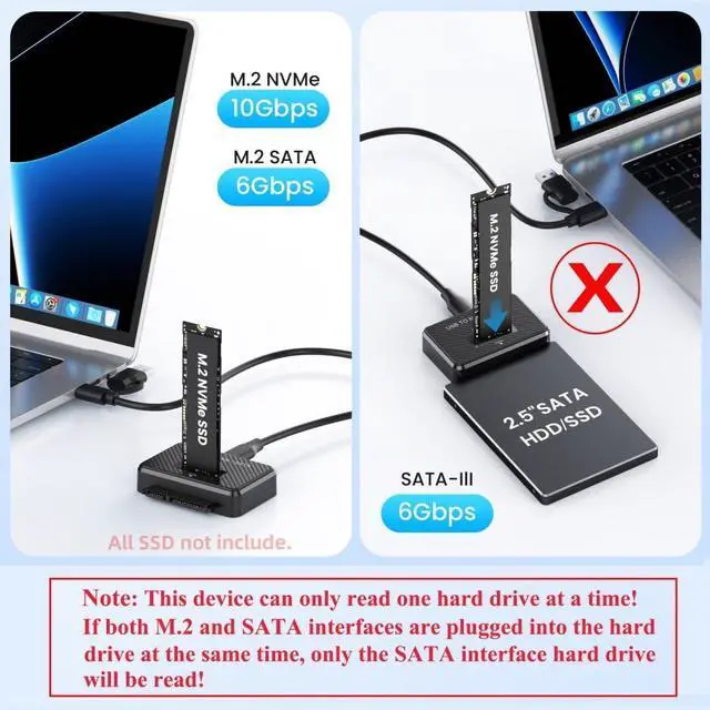 ^^ 3) Note: This device can only work with one drive at a time, If both M. 2 and SATA interfaces are plugged into the disk drive at same time, Only SATA interface driver can be worked. (All the disk don't support hot plugging, Please don't chagne the SSD when connecting on computer. ) ^^ 4) Attached Type-C & Type-A Cable, Type-C Cable Both side can be inserted; M. 2 NVME recommends USB-C Gen 2 10Gbps or USB4/TB3/TB4 for extreme speed performance. Backward compatible with USB 3.1 Gen1 and USB 3.0 up to 5Gbps. ^^ 5) The docking adopts a vertical design, which is convernient for insertion and removal, and also conducive to efficient heat dissipation. Non-slip silicone gasket on bottom.