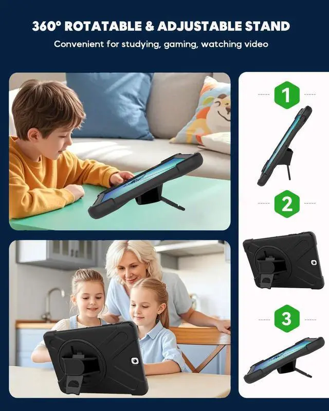 360deg SWIVEL & ADJUSTABLE HAND STRAP + DETACHABLE & ADJUSTABLE SHOULDER STRAP - With a rotatable and adjustable handle hand strap, easier to use your tablet with one single hand in your outdoor traveling, working, and gaming with kids. With an adjustable and removable shoulder strap, ha