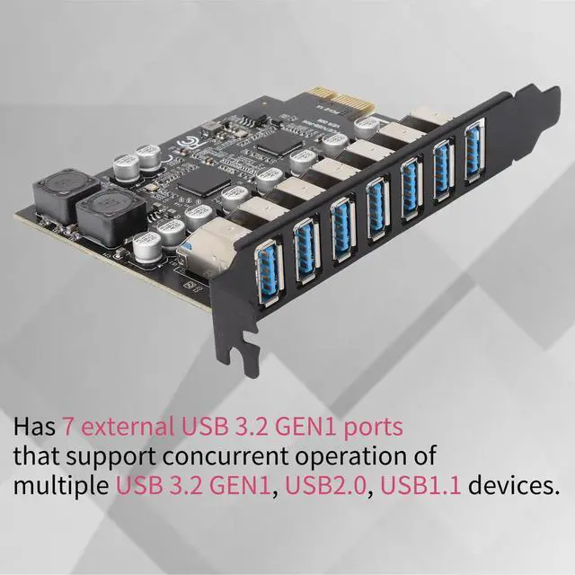 PCIE to USB 3.2 GEN1 Expansion: This PCIE to USB 3.2 GEN1 expansion card has 7 external USB 3.2 GEN1 ports that support concurrent of multiple USB 3.2 GEN1, USB2.0, USB1.1 devices.