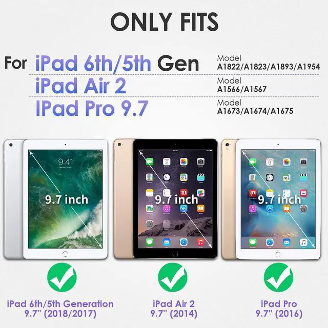 • Case for iPad 9.7 inch : Fits Air 2 / Pro 9.7 / 6th 5th Gen 9.7 inch. Model Number : Air 2 2014 (A1566, A1567) & Pro 9.7 2016 (A1673, A1674, A1675) & 6th/5th Gen 2018/2017 (A1893, A1954, A1822, A1823). and you can find step by step install instruction video in our store.