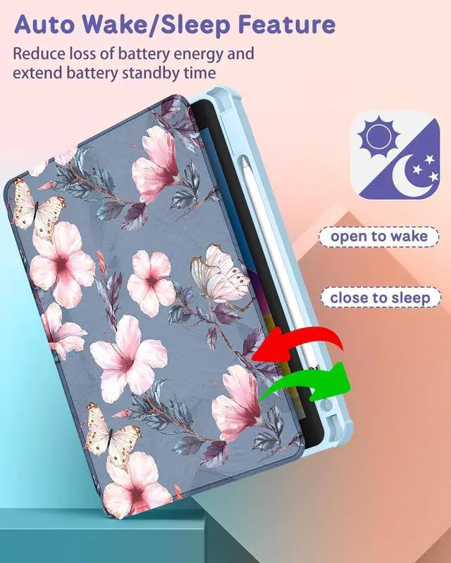 Auto Sleep/Wake: Built-in magnetic strip, this tablet case with the smart funtion of auto sleep/wake, no wasting the power energy and extend your iPad standby time