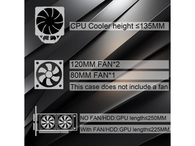 - GPU length limit: In the case of no chassis fan placed on the front board, the longest supported range of the graphics card is less than or equal to 250MM. If a fan is placed on the front board, the longest supported range of the graphics card is less than or equal to 225MM