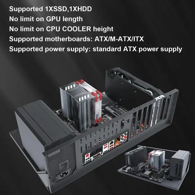 Supported 1XSSD/1XHDD ^^ No limit in GPU length ^^ No limit in CPU COOLER height ^^ Supported motherboards: ATX/M-ATX/ITX ^^ Supported power supply: Standard ATX power supply