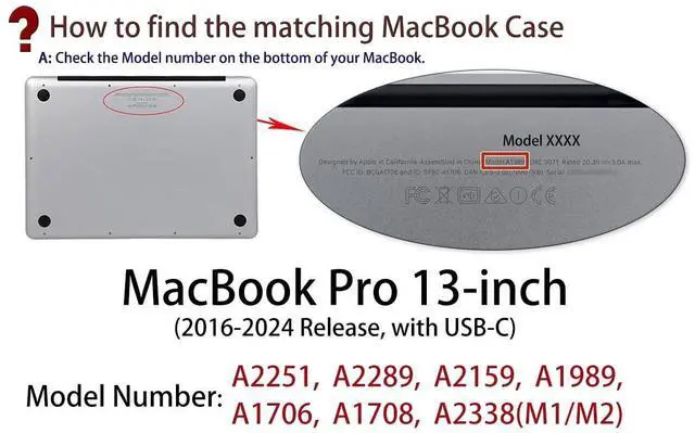 Ports: Case Design lets you Open/Close your MacBook all the way and Access to all Ports. *Crafted with vent slots to ensure proper heat dissipation. *No Apple Logo cut out design. ^^ NOT Compatible with Macbook Air 13", Not Compatible with old MacBook Pro 13" with CD-ROM A1278 and 2012-2015 MacBook Pro Retina 13" (A1502/A1425). ^^ Please double check your MacBook's model number "Axxxx" on the bottom of the laptop to determine the compatibility. ONLY for Model A2338 / A2289 / A2251 / A2159 / A1989 / A1706 / A1708.