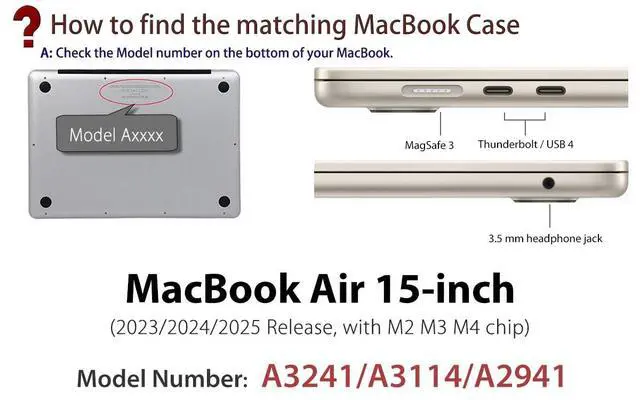 • Compatible with: Compatible with: 2023 2024 2025 Release MacBook Air 15 inch M2 M3 M4 chip, Model: A2941/A3114/A3241, with 15.3 inch (diagonal) Liquid Retina display / Touch ID. Does not for other version MacBook. Does not for other version MacBook