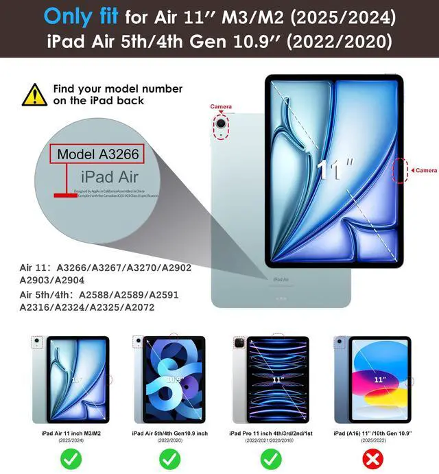 Specifically designed for the Apple iPad Air 11 inch 7th/6th Generation tablet M3/M2 2025/2024(Model Number: A2902/A2903/A2904), aslo fit iPad Air 5th/4th generation 10.9 inch tablet 2022/2020(Model Number: A2588/A2589/A2591/A2316/A2324/A2325/A2072).Also fit Apple iPad Pro 11 inch 4th/3rd/2nd/1st 2022 & 2021 & 2020 & 2018 Tablet(Model Number: A2759/A2435/A2761/A2762/A2377/A2459/A2301/A2228/A2068/A2230/A1980/A2013/A1934). Not compatible with any other iPad model