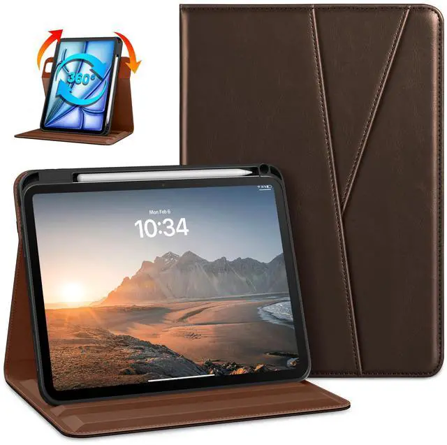 DTTO Rotating Case for iPad Air 11-inch M3 / M2 (2025/2024), iPad Air 5th / 4th Gen (2022/2020), 360 Degree Swiveling Premium Leather Folio Stand Cover with Pencil Holder, Dark Brown