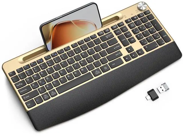 [(Ergonomic Design with Wrist Rest)] Gold keyboard designed with a generous palm rest and tilt legs, offers a better typing position to reduce the pressure on your wrist. The usb gold wireless keyboard has a comfortable touch and typing feel, every detail is carefully crafted to fit your hand fully.(Special Reminder: This product is a USB wireless keyboard,and no mouse included. Please be informed.)