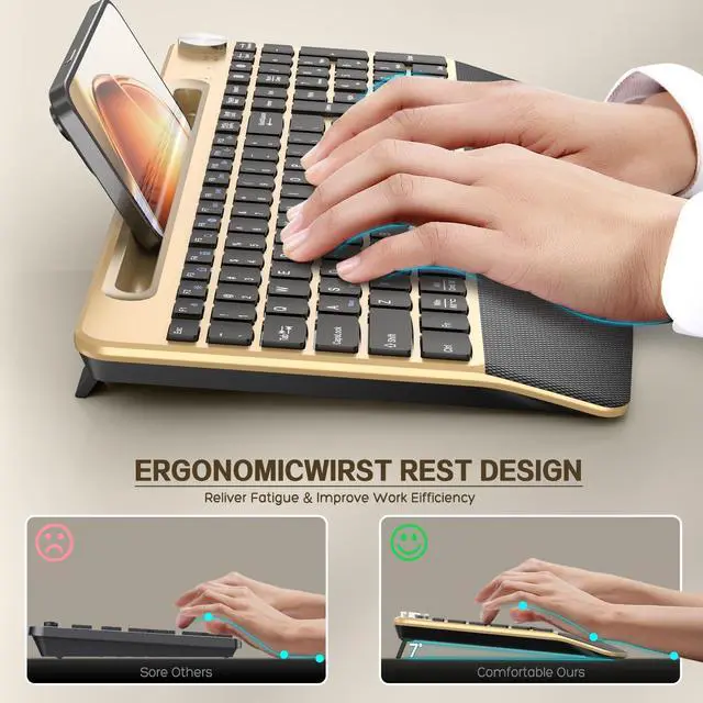 GAMCATZ Ergonomic Wireless Keyboard with Wrist Rest-Low-Profile, Phone/Tablet Holder, Quiet Design, Windows & Mac OS, Full Size Cordless USB Computer Keyboard for Desktop, Laptop, PC, Mac, Windows-Gold