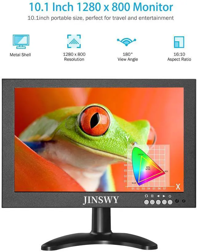 JINSWY 10.1" Security Monitor, 1280 x 800 HD Display, 16:10 IPS Metal Portable Mini CCTV Monitor, HDMI VGA BNC AV USB Ports, Built-in Speakers & Remote Control, for DVR, PC, Raspberry Pi