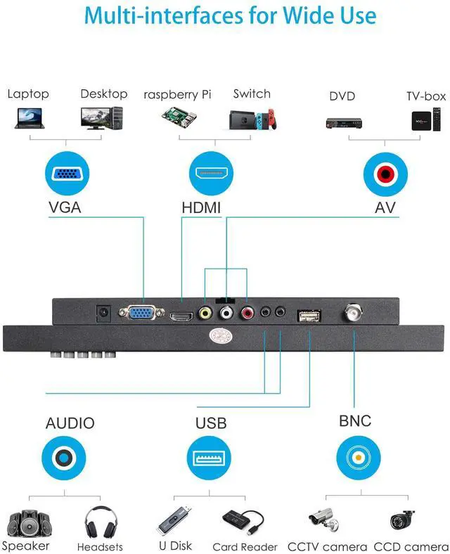 [(Versatile Video Input)] Connect effortlessly with HDMI, VGA, BNC, AV, USB, and audio inputs. This versatile monitor is compatible with Raspberry Pi, DSLR cameras, PCs, DVD players, TV boxes, gaming consoles, and more. Use it as a secondary display or even as a small TV by connecting a TV box.