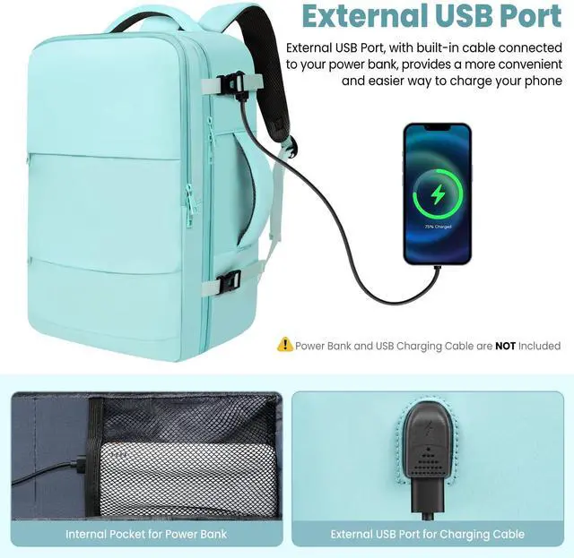 Convenient USB Port: Large carry on backpack with USB port outside and the cable to connect your power bank inside, this suitcase backpack for travel offers you a more convenient way to charge your phone while walking. Please note that the powerbank and the cable to charge the phone are not included in this travel laptop backpack.