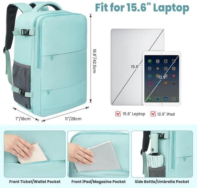 Roomy Capacity & Multi-Pockets: Dimensions 42.5*28*18cm (16.8*11*7 inch), Light Weight 0.75 Kg (1.65 lb), has 3 main large compartments and 10 allocated inner and side pockets. Makes your item organized and easier to find. The laptop compartment holds a 15.6 inch laptop and a 12.9 iPad, and the travel backpack provides a dedicated space for your wallet, clothes, bottle and other travel essentials.