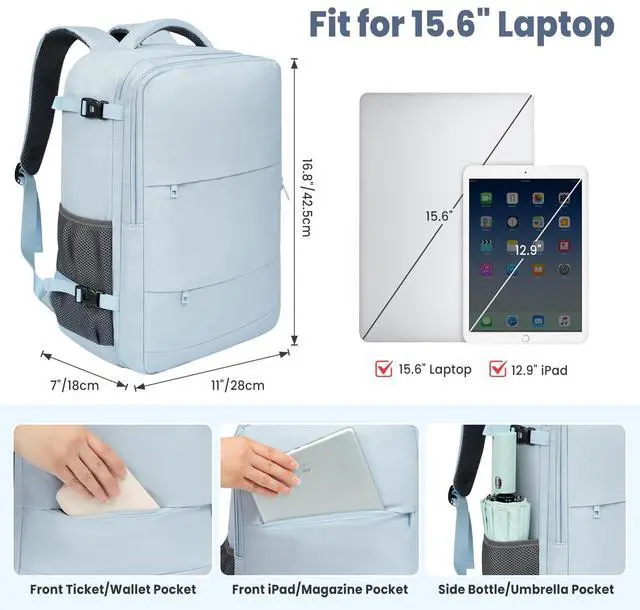 Capacity & Multi-Pockets: Dimensions 42.5 *28*18cm ( 16.8 *11*7 inch), Light Weight 0.75 Kg ( 1.65 lb), has 3 main large compartments and 10 allocated inner and side pockets. Makes your item organized and easier to find. The laptop compartment holds a 15.6 inch laptop and a 12.9 iPad, and the travel backpack provides a dedicated space for your wallet, clothes, bottle and other travel essentials. ^^