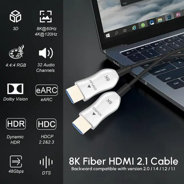 8K Fiber HDMI 2.1 Cable -- Optical hdmi cable 50ft supports High-speed 48Gbps, 8K@60Hz, 4K@120Hz, 2K@240Hz, Dynamic HDR, Dolby Vision, eARC, HDCP 2.2 & 2.3, 3D, 32