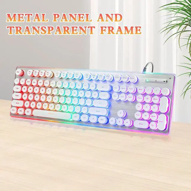 ANSWK Typewriter Style Keyboard with Metal Panel, Rainbow LED Backlit, Round Keys, Anti-ghosting, Spill Resistant, Light Up USB Wired Retro 104 Keys for Office/Gaming, White/Silver