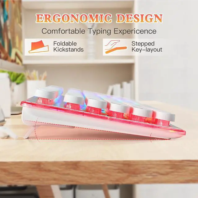 104 Keys Ergonomic Keyboard Ergonomic design with 2 angle feet on the back of the keyboard, smooth lines, comfortable feeling, and anti-fatigue. 12 multimedia keys combinations, 19 keys non-conflict. 12 combinations of multimedia keys facilitat