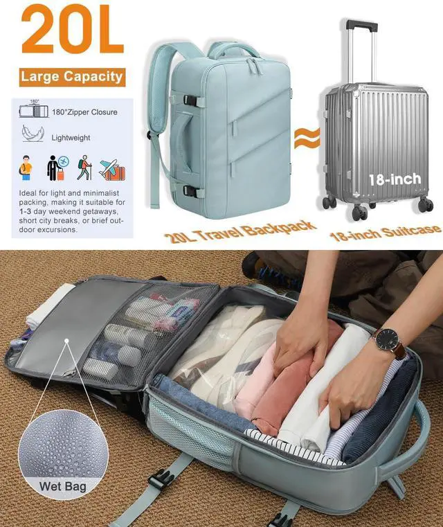 20L Capacity & 11 Pockets to Keep Organized:Roomy main compartments with 180deg opening zipper allow access from the top like a traditional backpack or fully open like a suitcase. Say goodbye to mess and now every item has its place.2 front pockets for easy access to travel essentials, while a dedicated wet/dry bag separates toiletries. 1 zipper mesh pocket provides visual storage, Padded laptop compartment with 1 organizer pocket is nice for small items, keeping everything neat and within