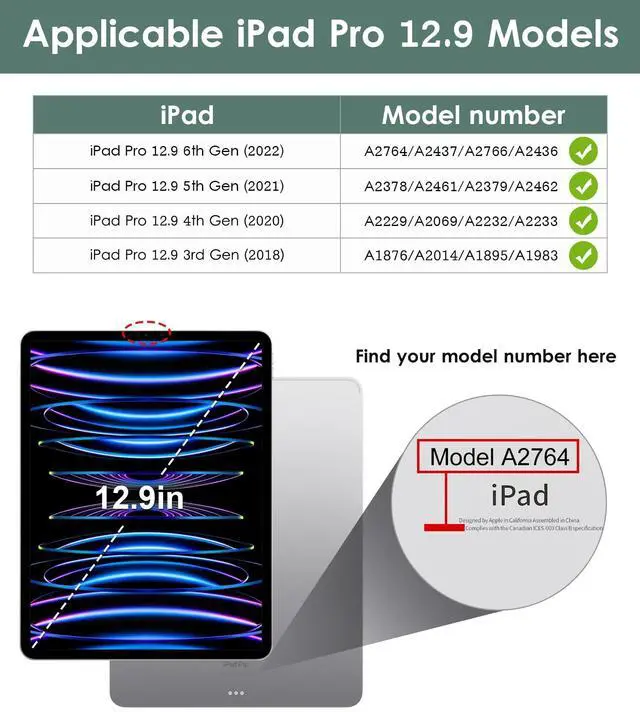 Compatibility - Designed for the Apple iPad Pro 12.9 6th / 5th / 4th / 3rd Generation (2022/2021/2020/2018 released),Model Number: A2764/A2437/A2766/A2436/A2378/A2461/A2379/A2462/A2229/A2069/A2232/A2233/A1876/A2014/A1895/A1983. Not compatible with any other iPad model.