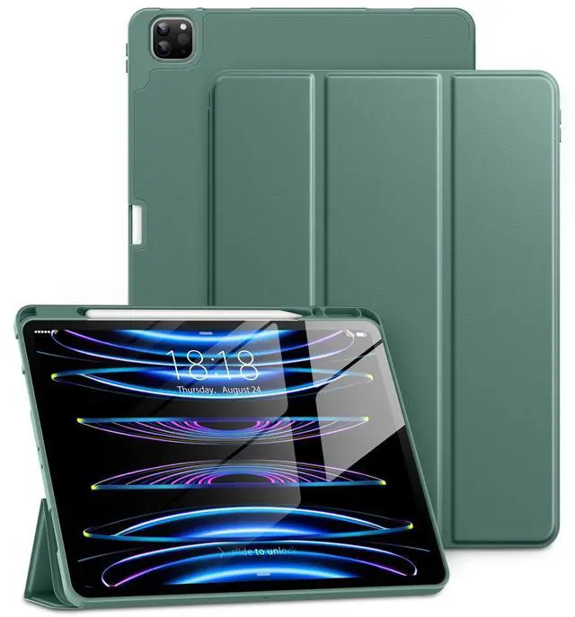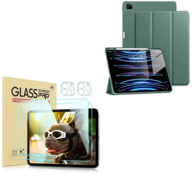 DTTO for iPad Pro 12.9 Inch 6th / 5th / 4th / 3rd Generation Case with Pencil Holder, Smart Slim Trifold Stand Cover with 2 Pack HD Tempered Glass Screen Protector, Midnight Green